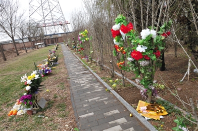 昨日,在位于长青园西北部的树葬群,数棵刚打苞的木槿树上缠绕着各色塑料花和绿叶,树前摆放着小盒的贡品。记者在树葬墓地周围等候近一小时,也未见有人前来祭拜。