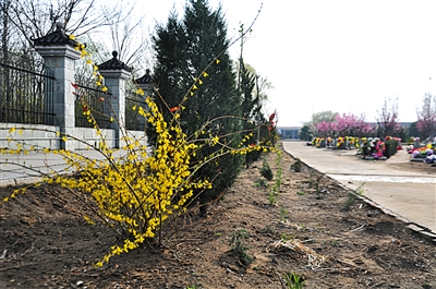 在长约50米,宽1.5米的园区的花葬区内,几株黄色的花朵刚刚绽开花朵。“北方花卉受气候影响很大,今年天气比较冷,所以花开得还不够茂盛。”叶青介绍,园区进行花葬时,会将骨灰盒和一捧花瓣一起埋入地下,地表不做任何标记,由陵园统一在泥土上种植时令草本花卉。