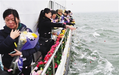 昨日上午,渤海湾,300名参与骨灰撒海海上共祭活动的北京市民将鲜花撒进大海,以祭奠缅怀逝去的亲人。当日,北京举行第二次骨灰撒海海上共祭活动。