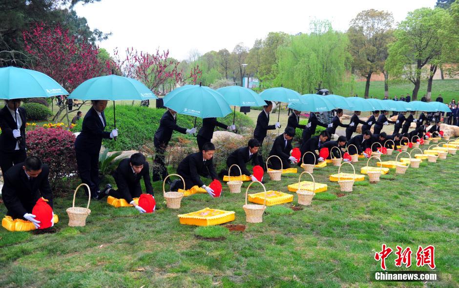 4月3日,在武汉石门峰纪念公园,工作人员为35位环保葬践行者举行生态环保葬礼。当日,武汉石门峰纪念公园开启“无条件全免费生态环保葬”活动,墓区将无条件为申请的民众提供全免费的生态环保葬服务,共同倡导绿色环保殡葬新理念。35位逝者的骨灰被安葬在一片草坪之下。骨灰盒采用可降解材质,3至6个月后,逝者骨灰将完全与土壤融为一体,回归大地。图为葬礼现场。中新社发 张畅 摄