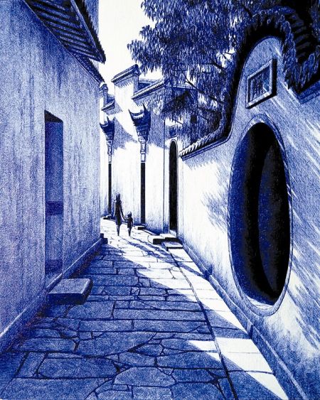 刘凯指着那幅让网友惊叹的《历史一隅》说,画中建筑是山西乔家大院的一处经典院落,圆珠笔的蓝色呈现了冷色调的效果,配上红红的灯笼,视觉上有一点寒意,既会让人想起《大红灯笼高高挂》的凄凉,又会让人对晋商曾经的辉煌遥望叹息。