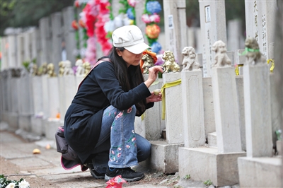 昨日上午,八宝山人民公墓,一名前来祭扫的女士,正在仔细描碑。 新京报记者 尹亚飞 摄