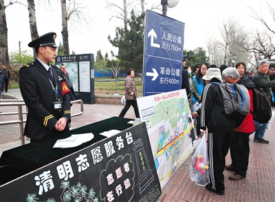针对祭扫人流较大,相关部门在附近公交站、地铁站均安排了志愿服务者,以便引导祭扫市民出行。