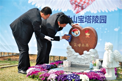 昨日,6岁女童丹丹的葬礼在三河市灵山宝塔陵园举行,父亲正为她擦拭墓碑。 新京报记者 林斐然 摄