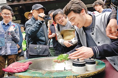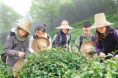 4月5日,浙江杭州高级中学的学生与来杭游学交流的瑞士卢加诺市一中的高中同学一起,来到西湖龙井茶基地一级保护区内的满觉陇村,体验茶园采摘、手工炒制及传统茶艺,感受中国茶文化的魅力。