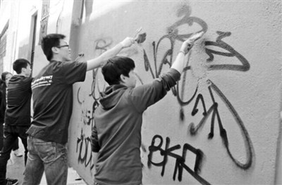 图为他们趁假期动手清理,让华埠墙壁焕然一新。