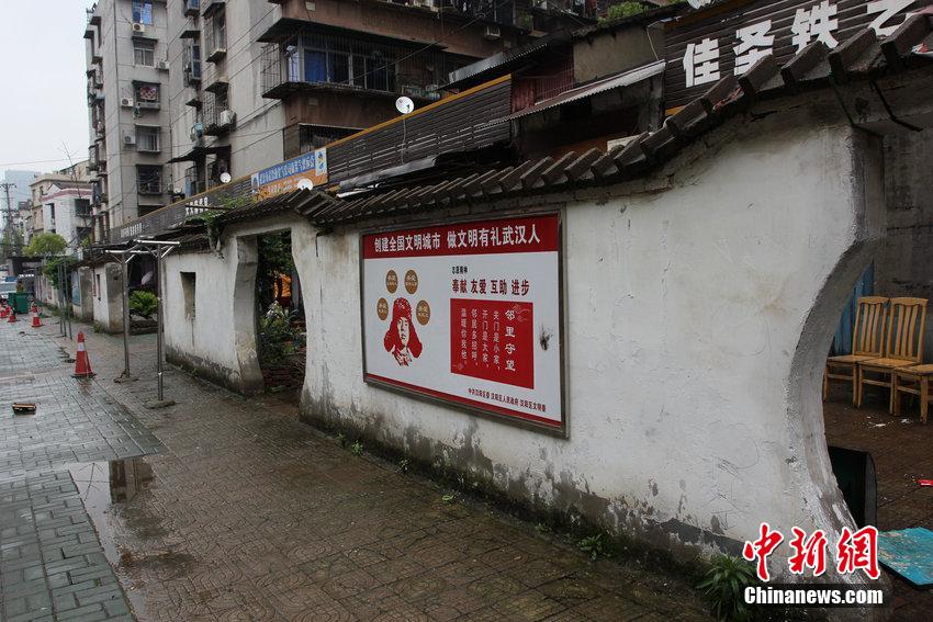 2015年4月6日,武汉百灵路,在人行道砌的被人戏称为“遮羞墙”的围墙。该墙墙顶有造型,从临街门面到墙根大约有3米的距离。这堵墙开着多个拱门供行人穿行。围墙内是门面平房和其其前面放置的各种杂物。甚至墙外也停着车辆和安有不锈钢架子。图片来源:CFP视觉中国