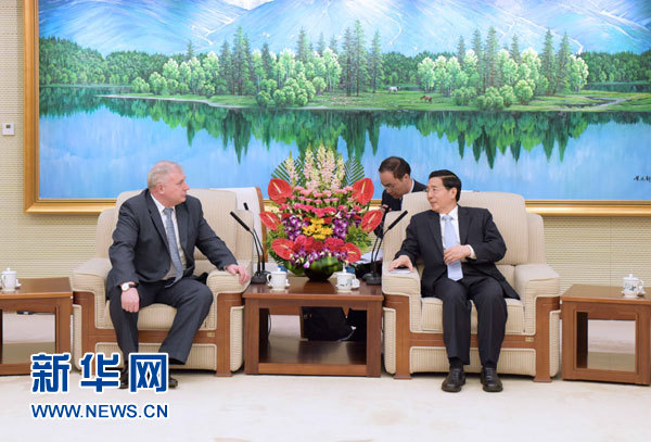 4月8日,中国国务委员、公安部部长郭声琨在北京会见白俄罗斯安全会议国务秘书梅茹耶夫。 新华社记者 张铎 摄