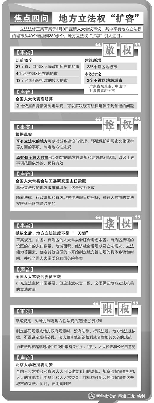 据了解,佛山目前承担着国务院及相关部委赋予农村综合改革、经济发达镇行政管理体制改革、征地制度改革等重大改革试点任务15项,其中许多任务都需要从法律层面予以明确规范。“而立法权的缺失,让佛山颇为头疼,走一步看一步的无奈,也让改革推进步履蹒跚。”在今年的全国两会上,立法法修正案草案提请审议前夕,广东省佛山市委书记刘悦伦表达了他对地方立法权的期待。
