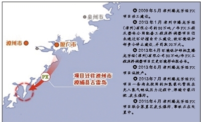 此外,2013年1月24日,环境保护部曾对漳州古雷PX项目的业主单位开出处罚书。原因是腾龙芳烃(漳州)有限公司80万吨/年对二甲苯(PX)工程及整体公用配套工程原料调整项目报批的变更环境影响报告书未经批准,擅自开工建设,违反了《环境影响评价法》的规定。