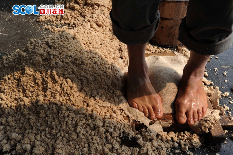 制作酒粬,人工踩踏成型,然后烘烤保温。