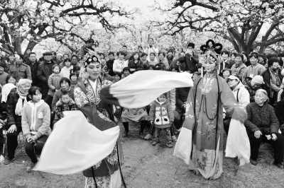日前,安徽省砀山县50万亩梨花吸引了众多游客前来赏花踏春,老梨园里的各项民俗活动更是让游客领略到了芒砀大地独特的人文魅力。唢呐、四平调、蓝印花布等国家级、省级非遗纷纷亮相,赏花踏春游升级成了探寻历史传承的“文化之旅”。截至目前,该县累计接待达游客40多万人次,旅游综合收入近亿元。图为”非遗”四平调表演吸引众多游客观赏。 崔猛摄