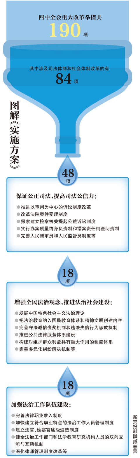 四中全会提出的190项重大改革举措中,有关进一步深化司法体制和社会体制改革的有84项,《实施方案》对84项改革举措进行了任务分工,逐项明确了主要任务、牵头单位和参加单位、改革进度和工作成果要求等事项,为各项改革任务落实提供了基本依据。