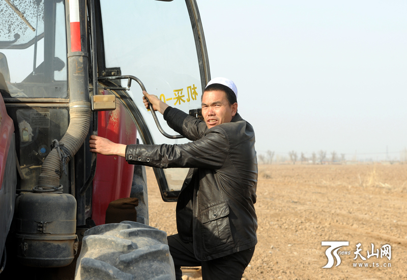 3月25日,在昌吉市二六工镇广东户村,种地大户马举保准备驾驶他的拖拉机开始耕地。