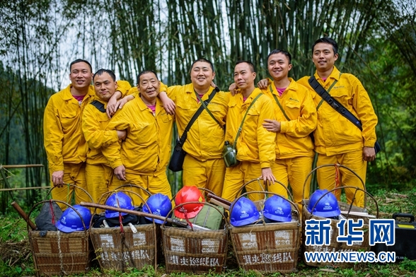 “背夹巡线队”队员舒敏、马洪波、王跃进、陈强、余江川、邵正义、王云峰(从左至右)合影留念(4月8日摄)。在贵州省道真仡佬族苗族自治县,有一支特别的“迎亲队”:平均年龄39.7岁的他们不着喜庆红装,也不带鞭炮喜糖,取而代之的是黄色工装和扳手弯刀;他们跋山涉水不是迎娶美丽的姑娘,只为点亮大山深处的“万家灯火”。贵州省遵义供电局输电管理所道真工作站,专门负责道真、正安、务川三县境内36万户、140万人的输电线路运维工作。为了工作方便,他们将常规的工具包换成了背夹,外界因此称之为“背夹巡线队”,当地人则形象地把他们叫做“迎亲队”。 新华社记者 刘续 摄
