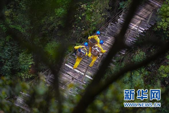 “背夹巡线队”队员在巡线途中经过一座腐朽的吊桥,桥下是数十米深的山涧(4月8日摄)。 新华社记者 刘续 摄