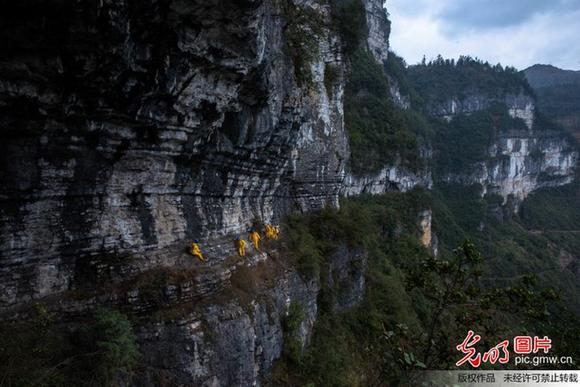 连绵高大的群山成为输电线路巡检的最大屏障,“背夹巡线队”常年在荆棘密布的丛林间、陡峭的断崖上行走,如同蜘蛛侠般穿行其间。(邓刚摄/光明图片)