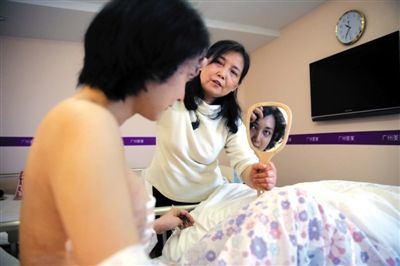 2015年3月5日,广州,刚做完胸部手术的刘霆还未康复,母亲拿着镜子给刘霆看。