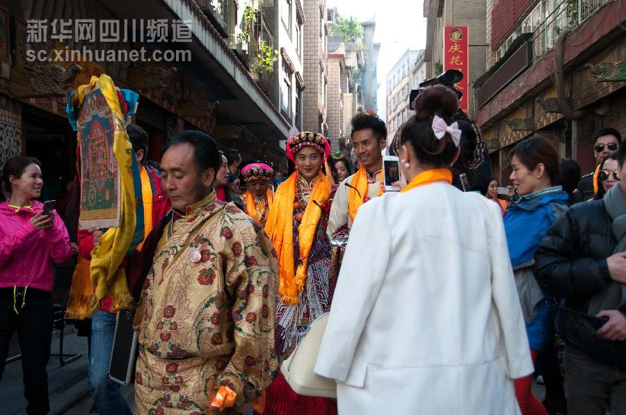 4月11日,身穿藏袍的新郎格绒彭措和新娘达瓦卓玛在一名“吉祥老人”的带领下走在丹巴县县城的大街上。