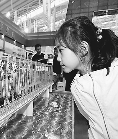 2014年6月15日,中国哈尔滨国际经济贸易洽谈会上,市民正在参观中俄同江铁路大桥模型。