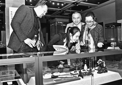 4月8日,在丝绸之路暨中国西部文化德国巡展西安预展上,参观者在观赏展品。