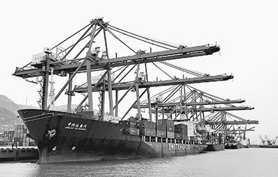 3月14日,多艘大型远洋运输轮停泊江苏连云港集装箱码头卸运进口货物。