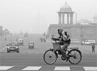 在新德里,记者切实感受到冬天比夏天难熬。印度的夏天固然高温,但空气质量尚可,空调、电扇外加白天少出门便可度日,而印度的冬天则更多是一番烟熏火燎喘不过气的“吭呛”岁月。以新德里为例,全城没有暖气系统,只有少数中产以上阶层购置了带暖风的空调,多数人家靠煤炉甚至是露天焚烧枯枝败叶取暖。再加上新德里市内及周边的火电厂加足马力燃煤发电,超过400万辆机动车集体排放,这些污染物在冷空气的作用下滞留在印度首都,特别是冬天的新德里从夜幕降临到黎明破晓这个时段里,记者多次遭遇了被风卷白雾逼得停车的窘境。