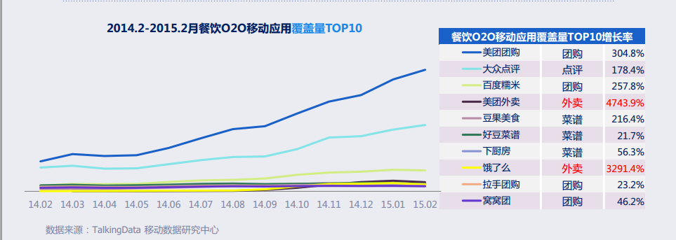 北京4月13日电(记者 杨月)日前国内最大的独立第三方数据服务提供商TalkingData发布了《2015年餐饮O2O移动应用行业报告》,报告显示,在餐饮O2O移动应用覆盖量TOP10榜单中,2014年外卖类应用增速最快,其中增速最快的一款达到约47倍。