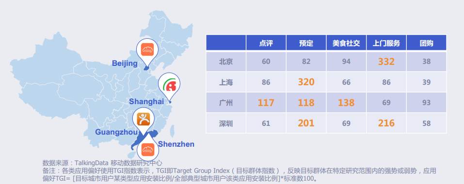 餐饮O2O移动应用使用行为中的一线城市偏好。数据来源:TalkingData