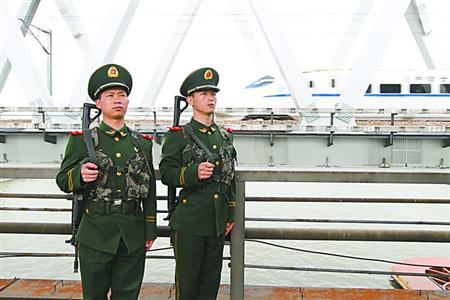 战士们在执勤,身后一列列车疾驰而过。 居嘉 摄