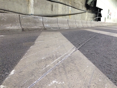 昨晚11时许,大屯路隧道,事发时被剐掉的墙皮尚未修复,地面上的剐痕仍清晰可见。新京报记者 浦峰 摄