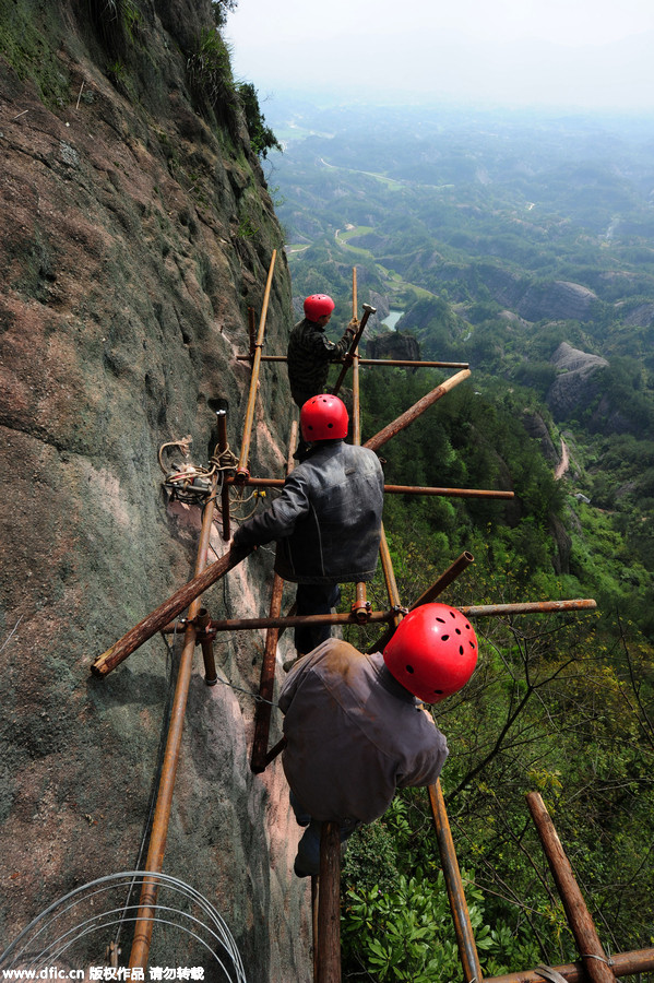 两名栈道工人在悬崖绝壁的栈道上进行混凝土浇筑倒模施工,待水泥干后,下面的支架才可撤除(图片来源:东方IC)。