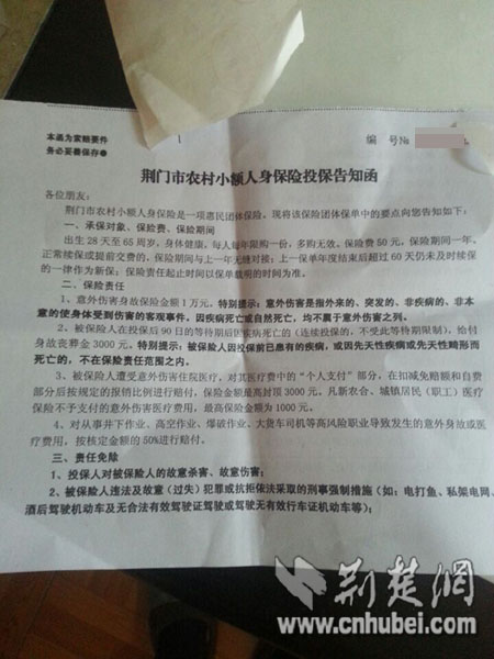 “我不是很愿意买这个保险,但是又不敢不买,怕得罪社区的人,而且买了连个收款凭证也不给。”刘先生气愤地说。随后,他向记者出示了一份社区发给他们的《荆门市农村小额人身保险投保告知函》。