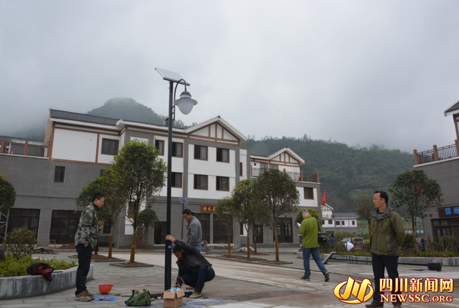 天全县灾后重建的南天新镇中心广场上,工作人员正在安装路灯。震后两年,这一紧邻318国道的新区正日益显现人气。