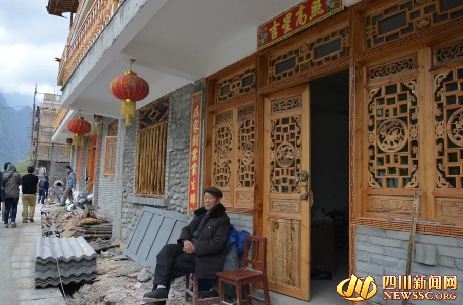 雪山新村,一位村民坐在刚刚搬进的新家门口。该村农房均为三层小楼,可分户进行零散的旅游接待。
