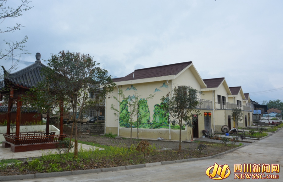有小亭乘凉,绿树掩映的墙边画着山水的彩绘,芦山县清仁乡大同村村民聚居点已有一番江南小镇的韵味。