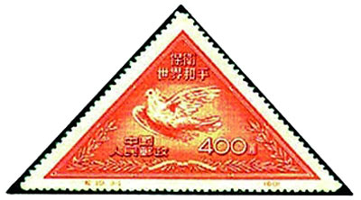 1951年8月15日我国发行《保卫世界和平(第二组)》纪念邮票,全套3枚同图,图案为西班牙著名画家毕加索画的和平鸽,票型为等腰三角形,这是我国发行的第一套异形邮票;2001年9月28日的《中国“神舟”飞船首飞成功纪念》邮票,全套2枚,图案为“火箭腾飞”和“飞船遨游”,票型为等边三角形。这是我国发行的5枚三角形邮票。此外我国还发行11枚菱形邮票、6枚圆形邮票、2枚多边形邮票、1枚平行四边形邮票。