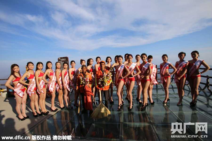 2015年4月17日,河南栾川老君山2000米悬空栈道,前来参加环球比基尼小姐大赛的选手们将她们的鲜花转送给向老君山的“蜘蛛侠”环卫工。