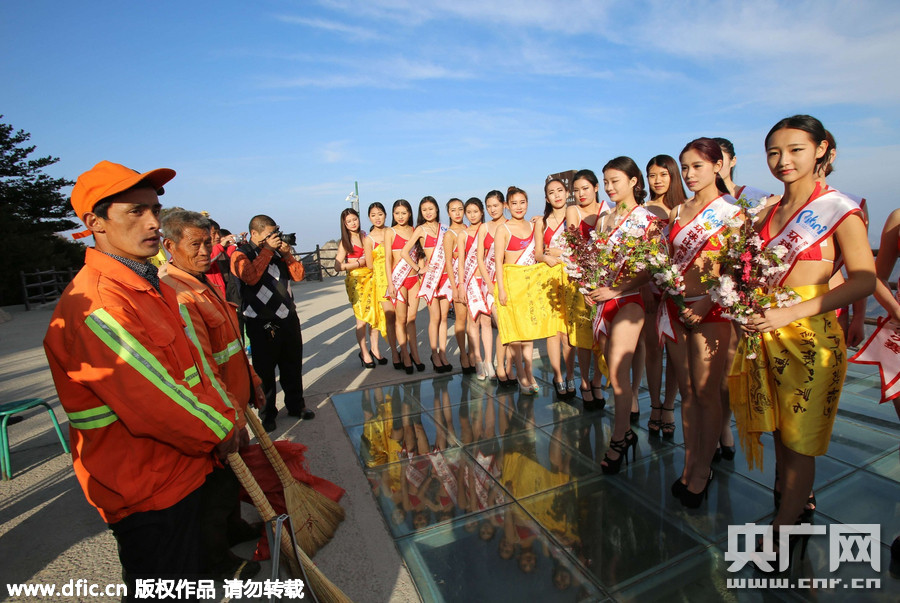 2015年4月17日,河南栾川老君山2000米悬空栈道,前来参加环球比基尼小姐大赛的选手们将她们的鲜花转送给向老君山的“蜘蛛侠”环卫工。