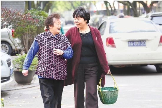 俞复玲(右)提着盒饭上班,一路和居民聊家常。通讯员李超摄