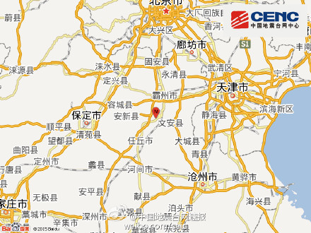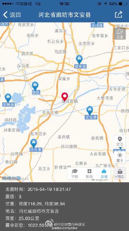 今日(4月19日18时21分)河北文安3.0级地震,震中位于史各庄镇附近,距离文安县城约15公里。