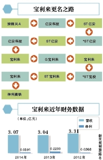 事实上,宝利来改名换姓的举动已非首次。根据资料统计,这家公司自从1992年上市以来,先后使用过的名字有“深锦兴A”、“亿安科技”,先后经营过的生意从粮油禽畜跨界至DVD、电动车,后又大转型为餐饮住宿业务。如今随着公司名称的变更,已经乏善可陈的餐饮住宿主业被公司淡化,一夜之间,公司变成继南北车之后的高铁明星股。