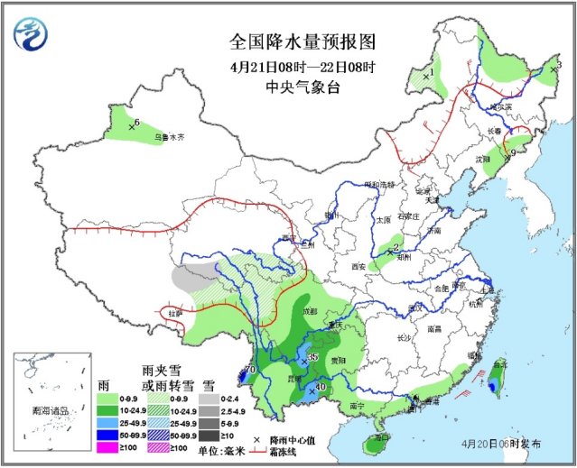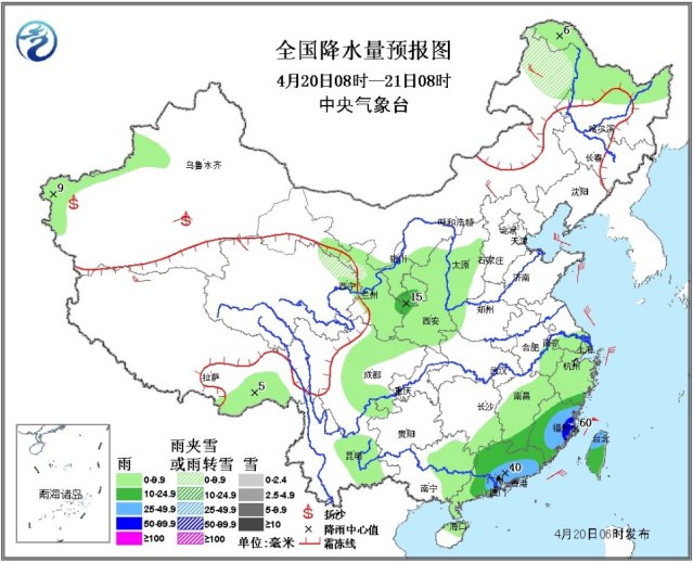 20日08时至21日08时,内蒙古东北部、青海东北部等地有雨夹雪或小雪;新疆西南部、西北地区东部、山西、江南东部和中南部、华南大部、云南东部、四川盆地北部和西部、西藏东南部、台湾等地有小到中雨,其中,福建中东部、广东中南部的部分地区有大雨,局地暴雨(50~60毫米),上述部分地区伴有雷暴。南疆盆地、内蒙古东部等地有4~6级风。南疆盆地的部分地区有扬沙或浮尘。东海南部,台湾海峡,台湾以东洋面将有7~8级、阵风9级的风。