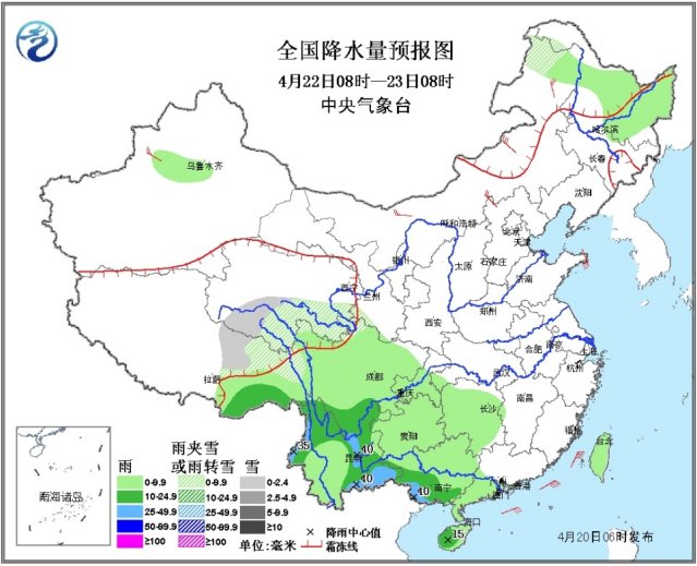 22日08时至23日08时,青海南部、西藏东北部等地的部分地区有小雪或雨夹雪;黑龙江中东部、华南西部、西南地区大部、西藏东南部、台湾等地有小到中雨、其中,云南东部和西北部、四川南部、广西西南部的部分地区有大雨。内蒙古中东部等地的部分地区有4~6级风。