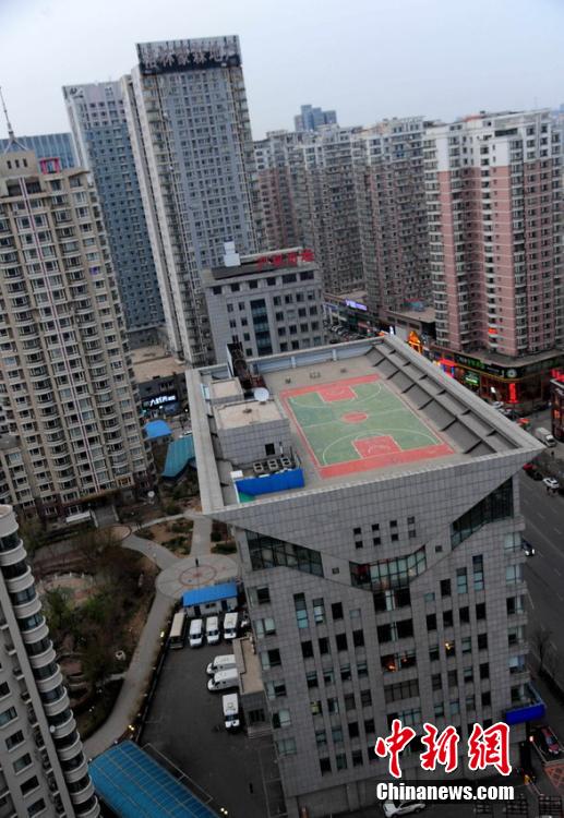 2015年4月19日,辽宁沈阳,在沈阳一近20层的高层建筑上,一个建好的篮球场吸引附近高层建筑上居住的市民注意。这个和正规篮球场一样大小的天台篮球场为一单位所建,为丰富员工业余文化生活。图片来源:CFP视觉中国