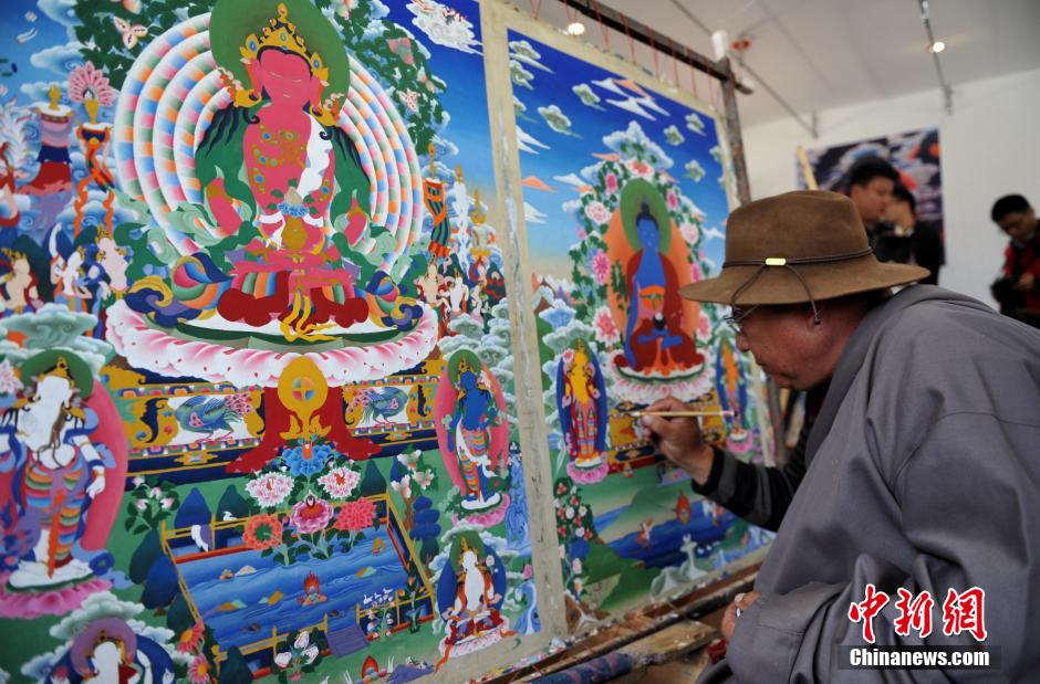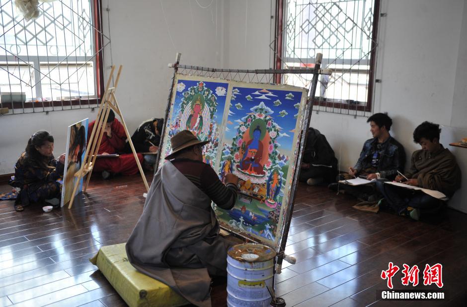 4月17日,炉霍唐卡博物馆画室内忙碌的老师和弟子们。当日,四川甘孜藏区炉霍县唐卡博物馆内的画室内,53岁的白马泽仁老师带领10余位学生坐在自己的作品前用心勾勒,完善画面细节,他们在继承传统唐卡艺术精华的同时,不断寻找唐卡艺术的灵魂与本真。炉霍县是一代唐卡画宗师郎卡杰的故乡,一部分作品至今还珍藏在拉萨布达拉宫。中新社发 刘忠俊 摄