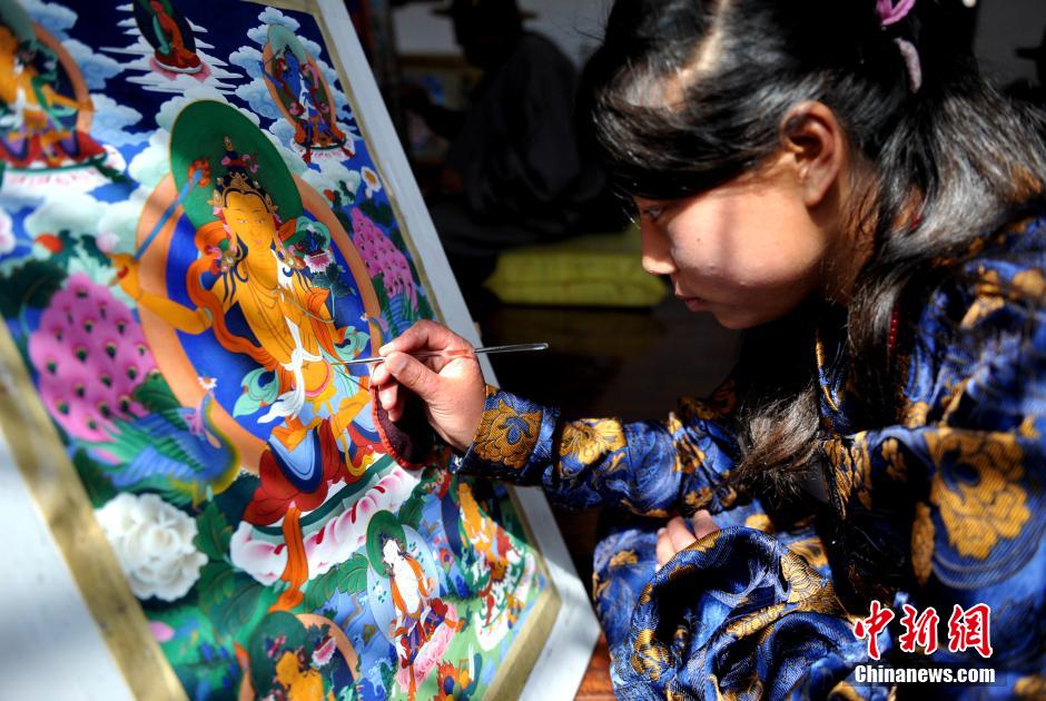 4月17日,学习画唐卡有2年时间的17岁的泽吉拉姆正在完成自己的一幅唐卡画。当日,四川甘孜藏区炉霍县唐卡博物馆内的画室内,53岁的白马泽仁老师带领10余位学生坐在自己的作品前用心勾勒,完善画面细节,他们在继承传统唐卡艺术精华的同时,不断寻找唐卡艺术的灵魂与本真。炉霍县是一代唐卡画宗师郎卡杰的故乡,一部分作品至今还珍藏在拉萨布达拉宫。中新社发 刘忠俊 摄
