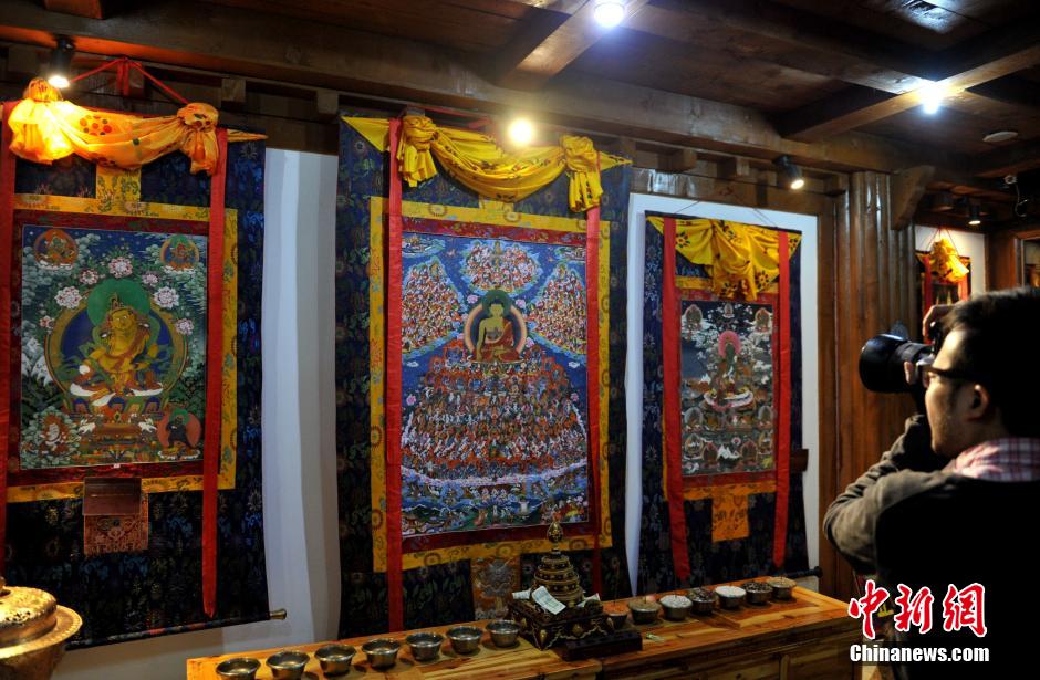 4月17日,炉霍唐卡博物馆内一位游客被漂亮的唐卡吸引。当日,四川甘孜藏区炉霍县唐卡博物馆内的画室内,53岁的白马泽仁老师带领10余位学生坐在自己的作品前用心勾勒,完善画面细节,他们在继承传统唐卡艺术精华的同时,不断寻找唐卡艺术的灵魂与本真。炉霍县是一代唐卡画宗师郎卡杰的故乡,一部分作品至今还珍藏在拉萨布达拉宫。中新社发 刘忠俊 摄