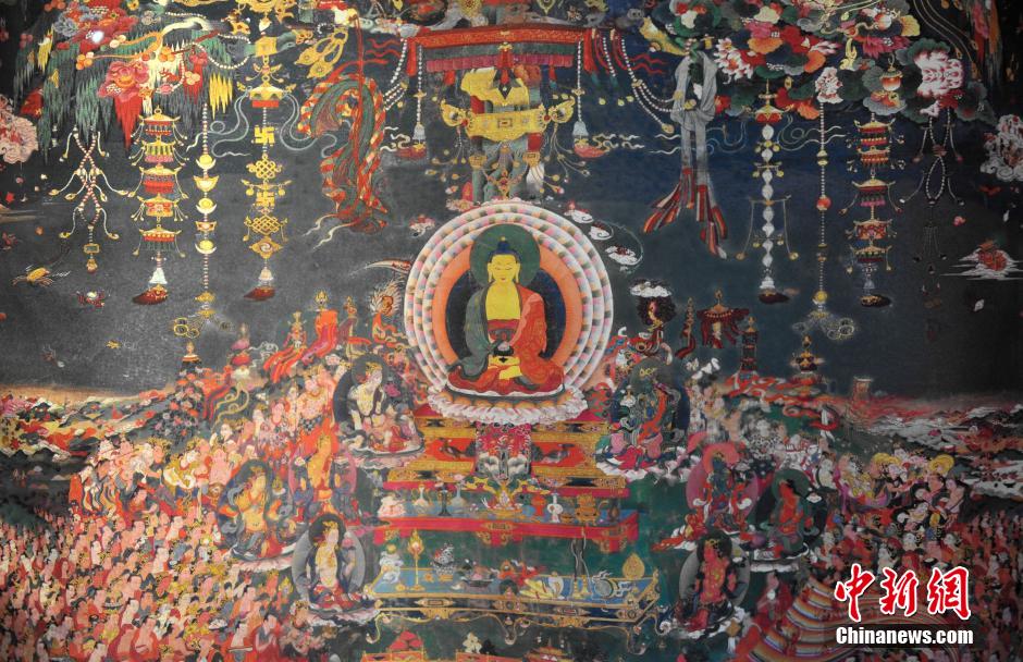 4月17日,炉霍博物馆内收藏的一幅《极乐世界》唐卡画局部。当日,四川甘孜藏区炉霍县唐卡博物馆内的画室内,53岁的白马泽仁老师带领10余位学生坐在自己的作品前用心勾勒,完善画面细节,他们在继承传统唐卡艺术精华的同时,不断寻找唐卡艺术的灵魂与本真。炉霍县是一代唐卡画宗师郎卡杰的故乡,一部分作品至今还珍藏在拉萨布达拉宫。中新社发 刘忠俊 摄