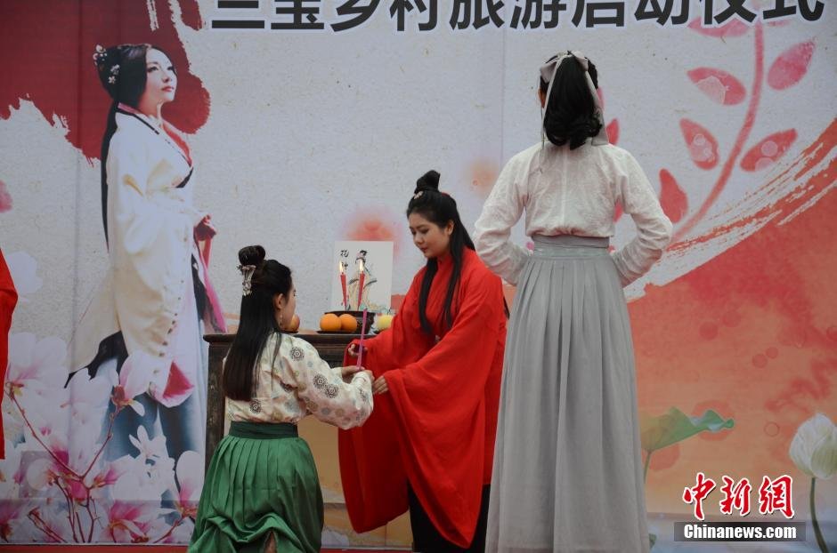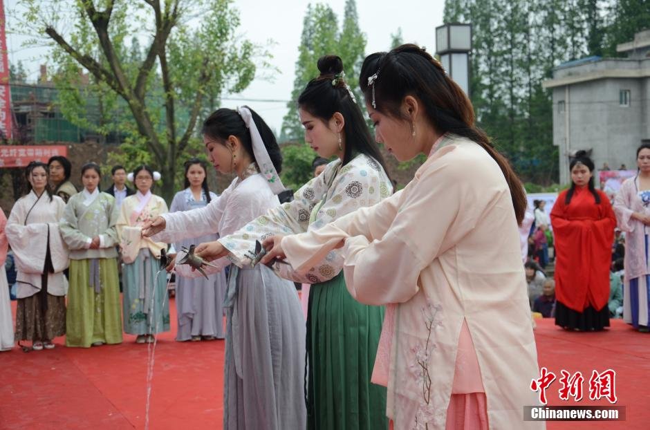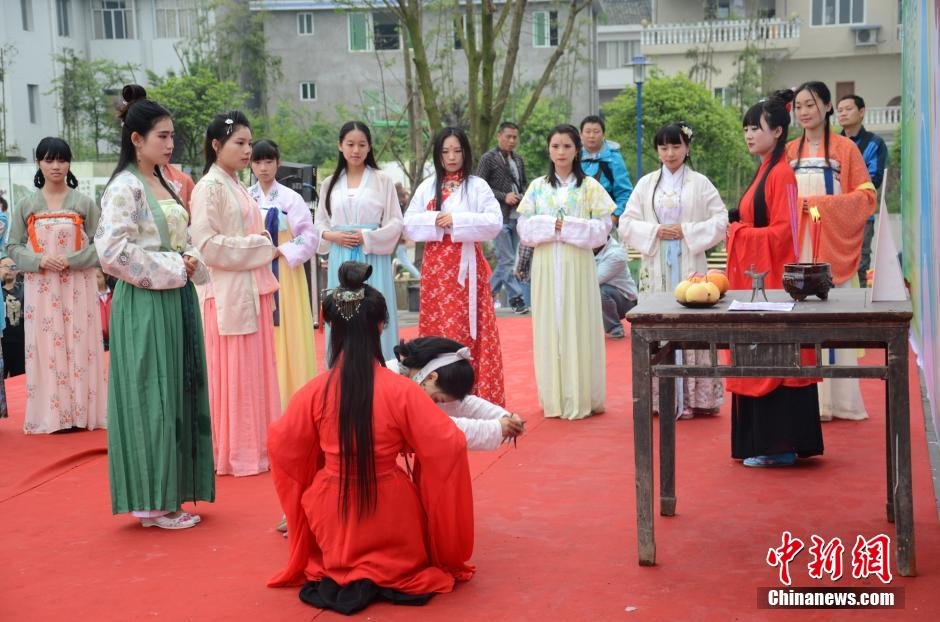 4月19日,四川洪雅县首届“花朝会”举行。当天,近百名雅女身着汉服,在三宝镇中心广场进行了浓重“花神”祭拜仪式。刘刚 摄